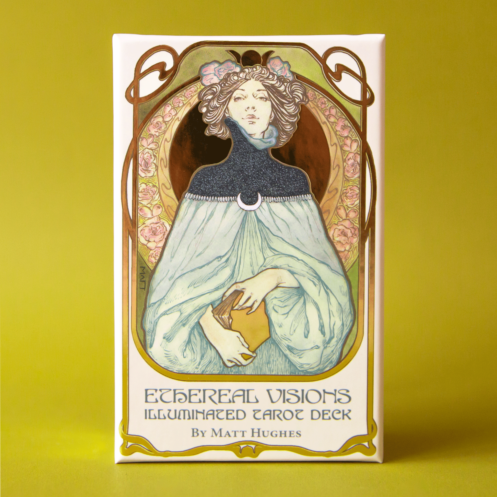 In creating Ethereal Visions Tarot Matt Hughes has drawn inspiration from the Art Nouveau movement, adopting its distinctive style and meticulous approach to craftsmanship. The artist has also created two additional cards to supplement the traditional Major Arcana. Every detailed image in the 80-card deck is hand drawn and colored. Each card is illuminated with gold foil stamping, to elegant effect. Includes a 48-page booklet. Matt Hughes is a self-taught artist who focuses on the aesthetic approaches referred to today as "The Golden Age of Illustration". His style combines inspiration from the Art Nouveau, Pre-Raphaelite and Symbolist movements, to produce an artistic expression uniquely his own.